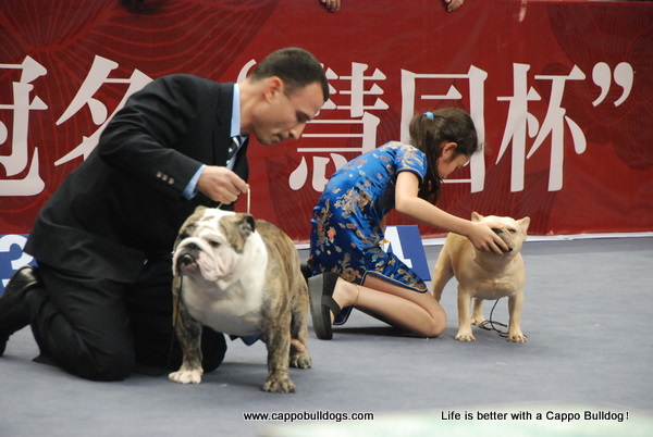 My daughter Nicole Cappo has been bugging us for your that she want a Frenchie. We have been trying to get her into the ring with a bulldog. But I can understand her fear as 10 years old that controlling and stacking a 60 pound bulldog might be a bit too much for her. Nicole has promised to show our new 20 plus pound Apollo. Let see if see keeps up to her part of the bargin. If not, Apollo is a great little buddy and we hope to get a few females in the future and have some fun in breeding them. Right now it's only fun in the right for this boy. Hope he like Chinese!